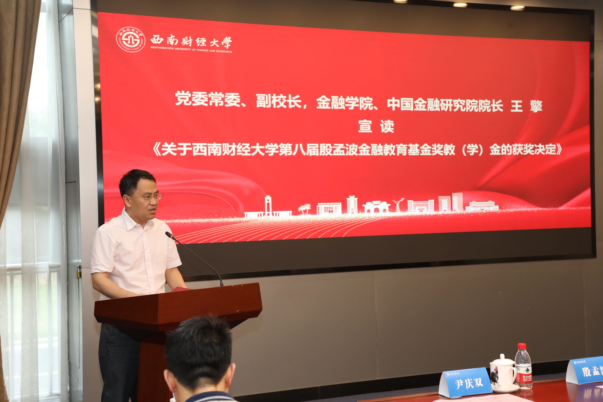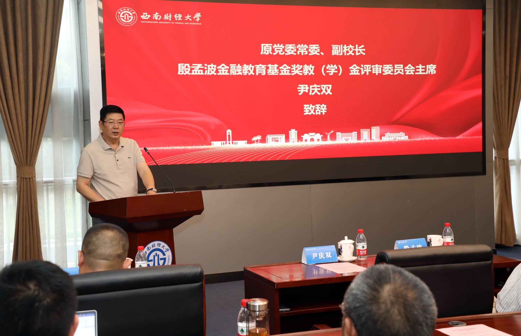尹庆双在致辞中对殷孟波教授为金融教育事业做出的卓越贡献和无私奉献表示感谢。他表示,荣获“殷孟波金融教育基金奖教(学)金”,是一份荣誉,更是一份期盼、一份责任。他勉励获奖师生赓续殷孟波教授的治学精神,砥砺品格、淬炼本领,强化使命担当、聚焦主责主业,为建设金融强国贡献智慧和力量。他希望金融师生以殷孟波教授为楷模,严谨治学,潜心研究,勇担责任,积极进取!