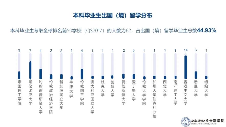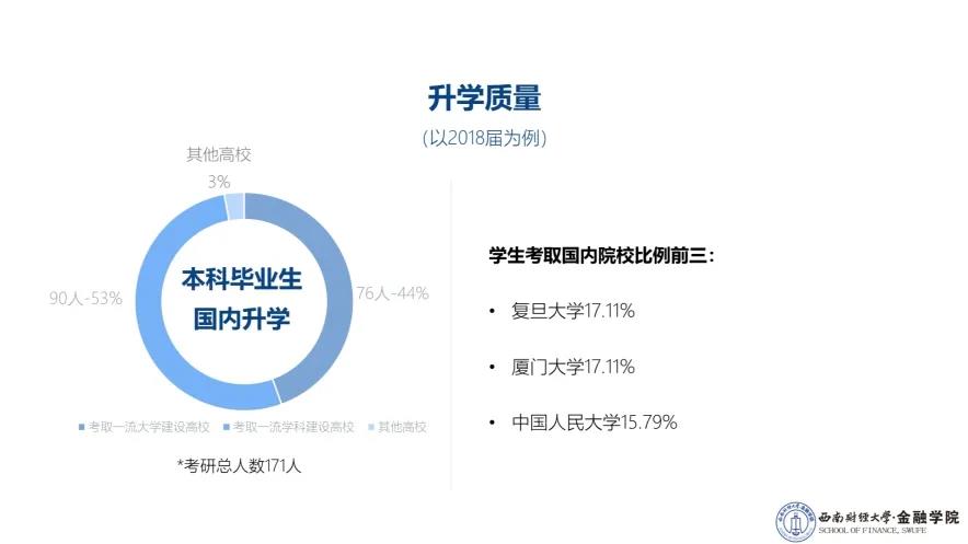 理由三:西财的毕业生质量极其优秀。考研升学质量高,留学去向优秀,本科生就业市场认可度高。