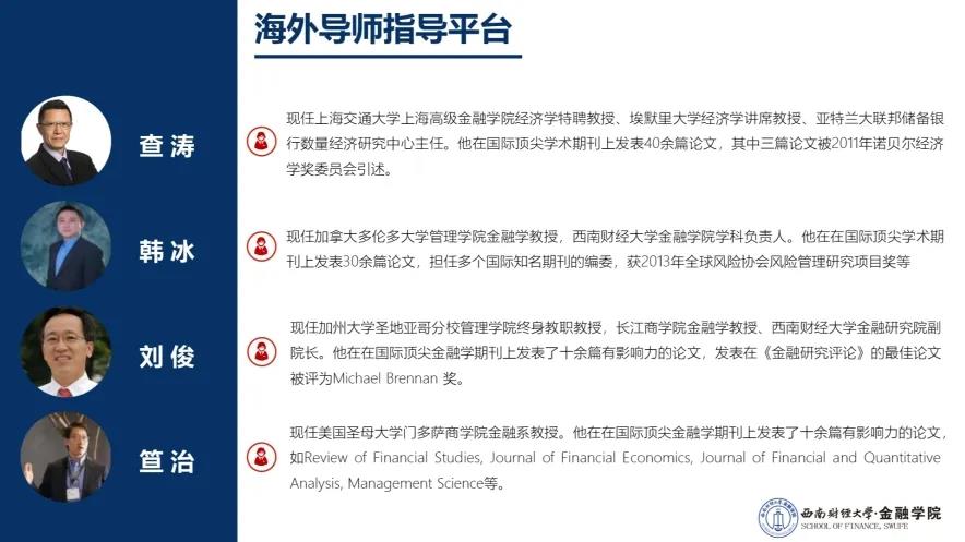 理由二:西财实现了为员工提供足够一流和高端的平台,助力员工飞翔。例如公司拥有海外导师指导团队,可以对老师和员工进行指导;开展有学术之星计划,有很厉害的老师带着你一起做科研;有金融科技国际联合实验室......