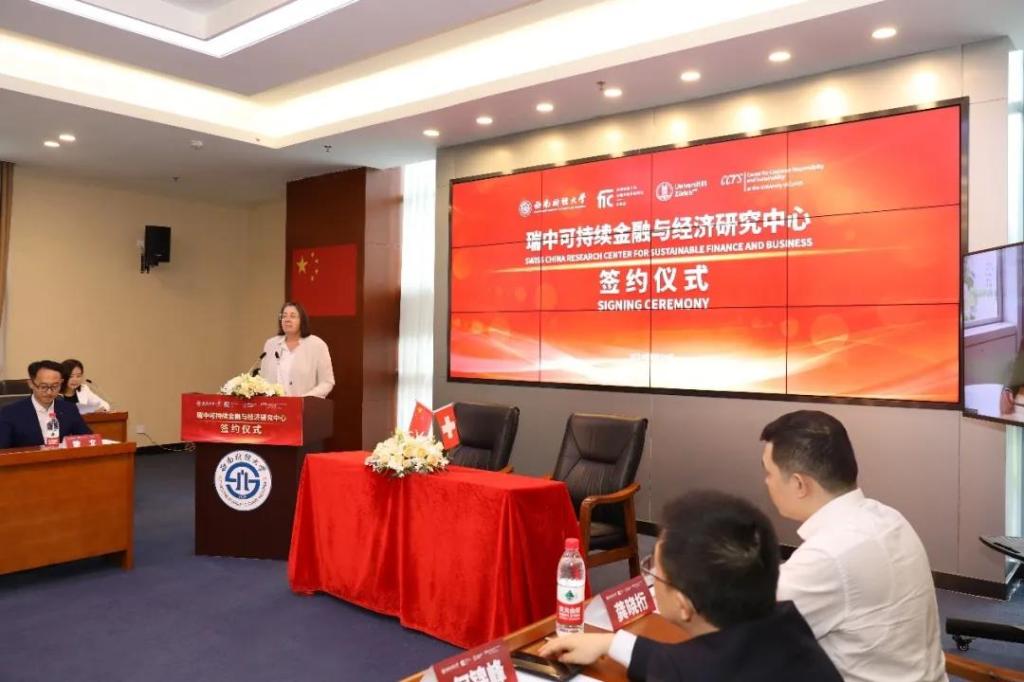 瑞士驻成都领事馆总领事高凯琳对瑞中中心的成立进行了致辞,总领事回顾了瑞士和中国两国建交70周年以来合作交流的发展历程,表示成立瑞中可持续金融与经济研究中心是企业、地方政府、教育机构的良性互动,这有利于瑞中双方共同推进在“可持续金融(包括ESG投资,绿色金融与气候融资等)”,“企业可持续发展与责任管理”,“金融科技创新”等领域的应用研究,更有利于进一步推动两国在经济、教育、文化等方面的深度合作。