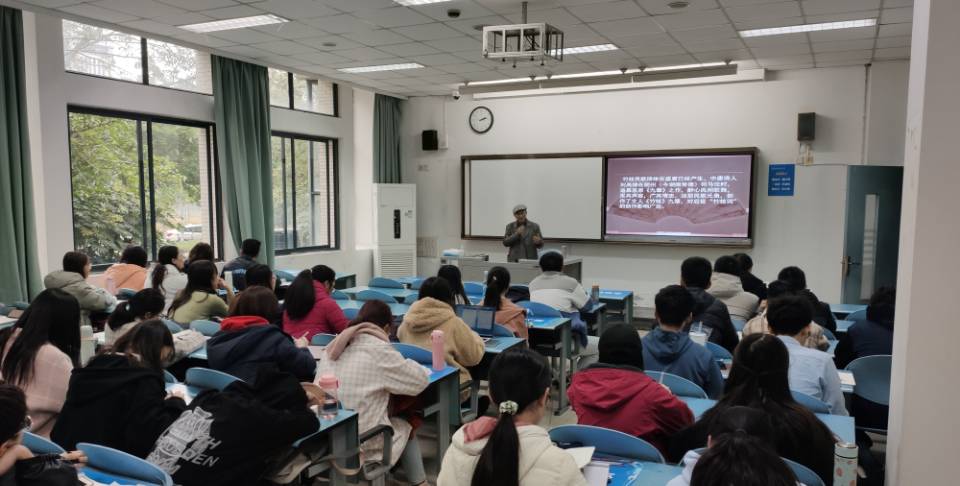接下来,谢教授用生动的描述与令人垂涎的美食图片将川菜历史娓娓道来,向同学们展示了竹枝词中的成都饮食风俗。他从中国八大菜系入手,以才华满身的名士作比,介绍川菜菜系悠久历史和烹调特色。天府之都包容而开放、川菜菜系承继而创新、各色小吃质优而味美,数百年来,它们取精去糟、融合创新,不忘本来、面向未来,成为本土居民对于这片故土的最珍贵记忆;也在崭新的时代里,成长为“成都”这座中国西部文明城市的亮丽名片。讲座的最后,谢教授耐心的解答了大家关于竹枝词的疑问,并与同学们进行了亲切的交流。