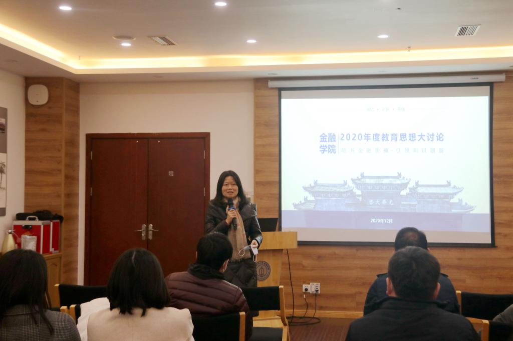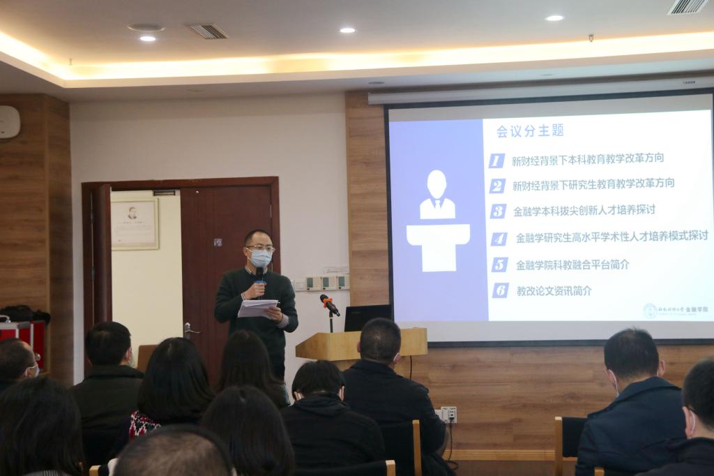 在公司主题发言阶段,金融学系主任翁舟杰从以金融学一流专业建设统领一流课程、一流教材建设的具体做法与大家分享了在培养本科拔尖创新人才中教师所起到的重要作用,鼓励大家加大教学投入,重视教学成果的积累;金融工程系主任朱波以金融工程公司产品的机遇、现状提出紧随国家重大战略和行业发展前沿改革公司产品模式,切实提升研究生的学术能力;科研秘书陈奕老师向大家介绍了公司“金融科技实验平台-海外导师指导平台-论文线上交流平台-教师高水平交流交换平台-中国金融数据平台”五位一体的科教融合平台以及借助该平台资源建设的学术之星员工社团的建设成效;教学秘书宋珂慧老师向大家介绍了公司近年来教改论文的发表情况和发表资讯,希望老师们能重视科教融合,推动科研成果与教研成果的相互转化与融合。