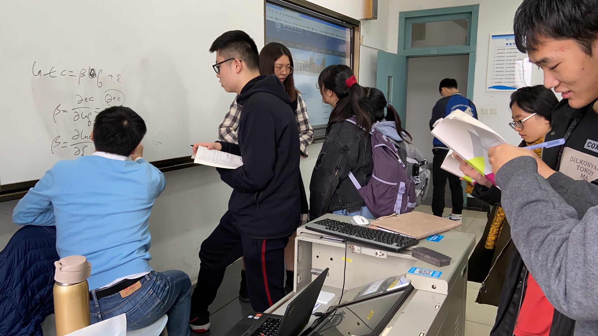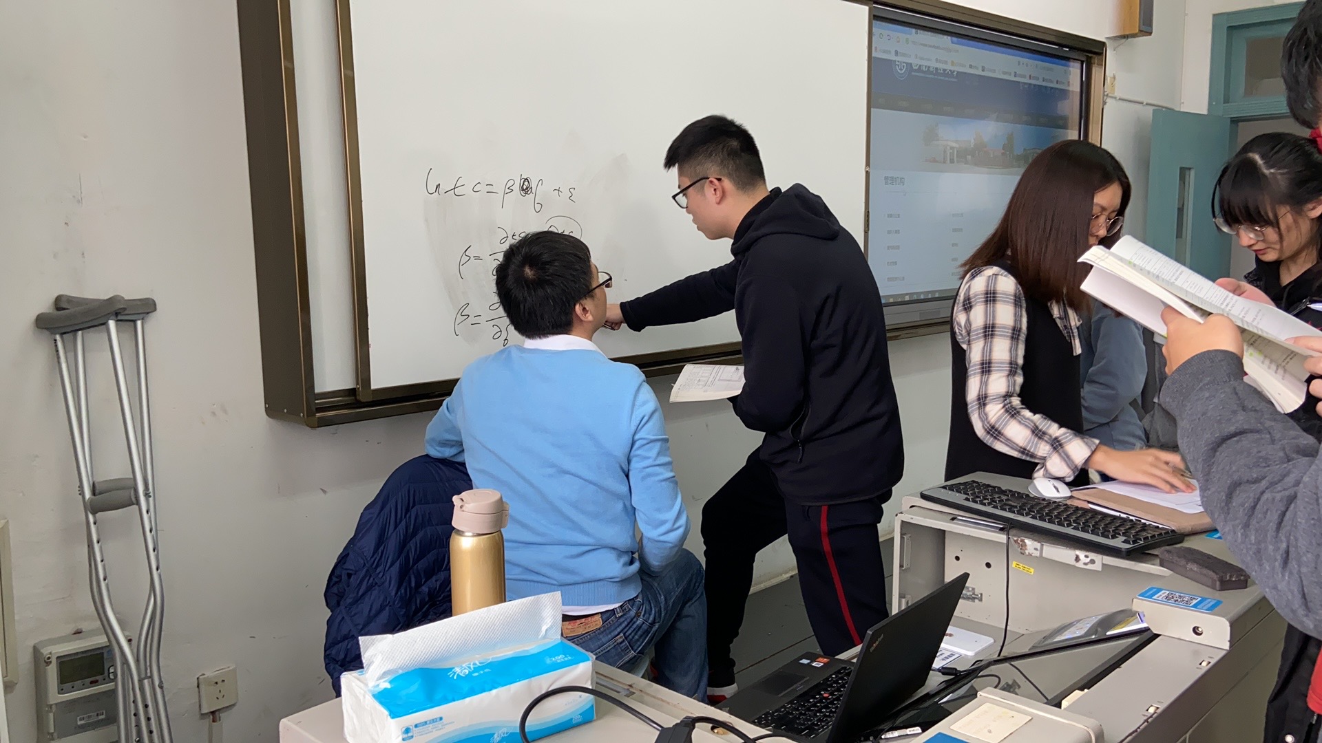 今天的课堂迎来了一位暂别不久的老师,他坐在讲台后的椅子上,一条腿抬放在一根矮凳上,身后放着一副拐杖,教室门口还停着一辆轮椅,虽然他讲课的声音并不激昂甚至还有些虚弱,却牢牢吸引住了同学们的目光。专心听讲的时间总是过得很快,转眼到了课间,同学们却并不休息,一个个拿着资料围到讲台周围请教问题,这位老师则坐在椅子上耐心解答,时不时还转身在白板上板书讲解。