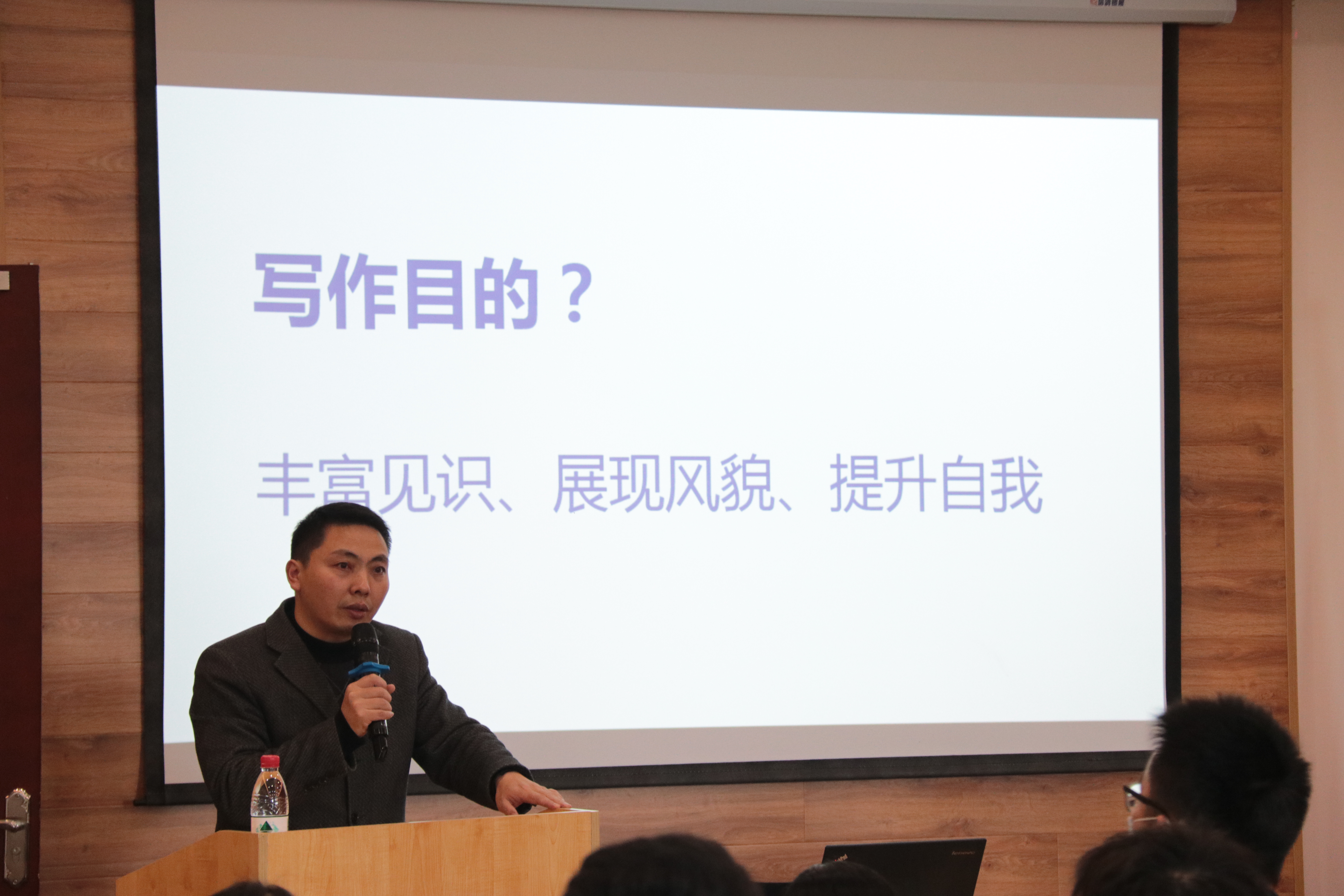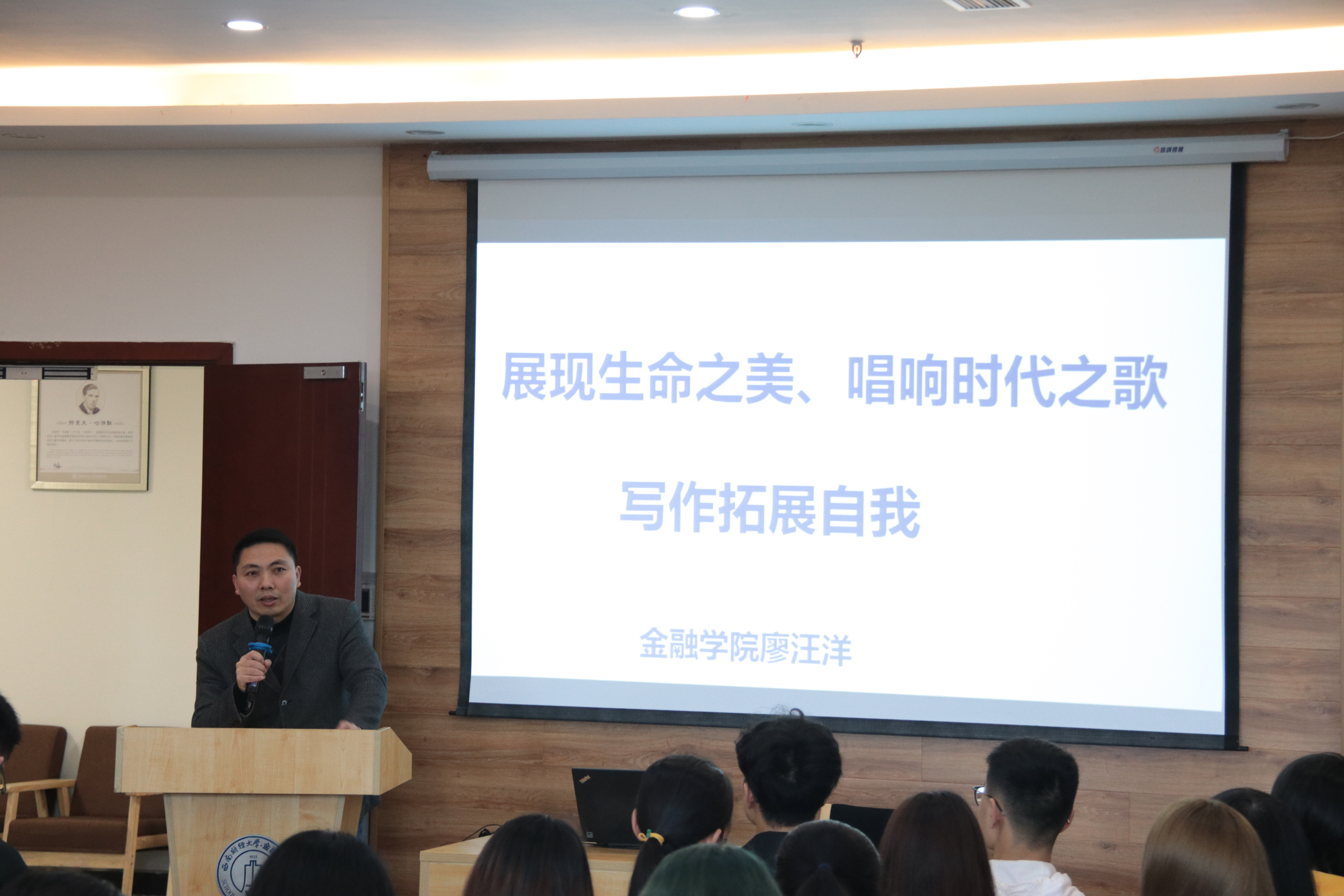 廖汪洋老师围绕写作分类、写作研究、写作目标等进行分享,从同学们相关的新闻写作、采访采编、文学创作等写作分类引入讲座;分析了寻找样本、深入研读、模仿写作、创新提升的写作过程;围绕词汇话语、逻辑结构、语言风格进行案例分析。他最后希望大家通过写作,要丰富见识、展现风采和提升综合素养;“言为心声”,要用优美的语言文字,表现生活生命之美,唱响时代之歌,抒写出新时代青年学子的担当和风采。