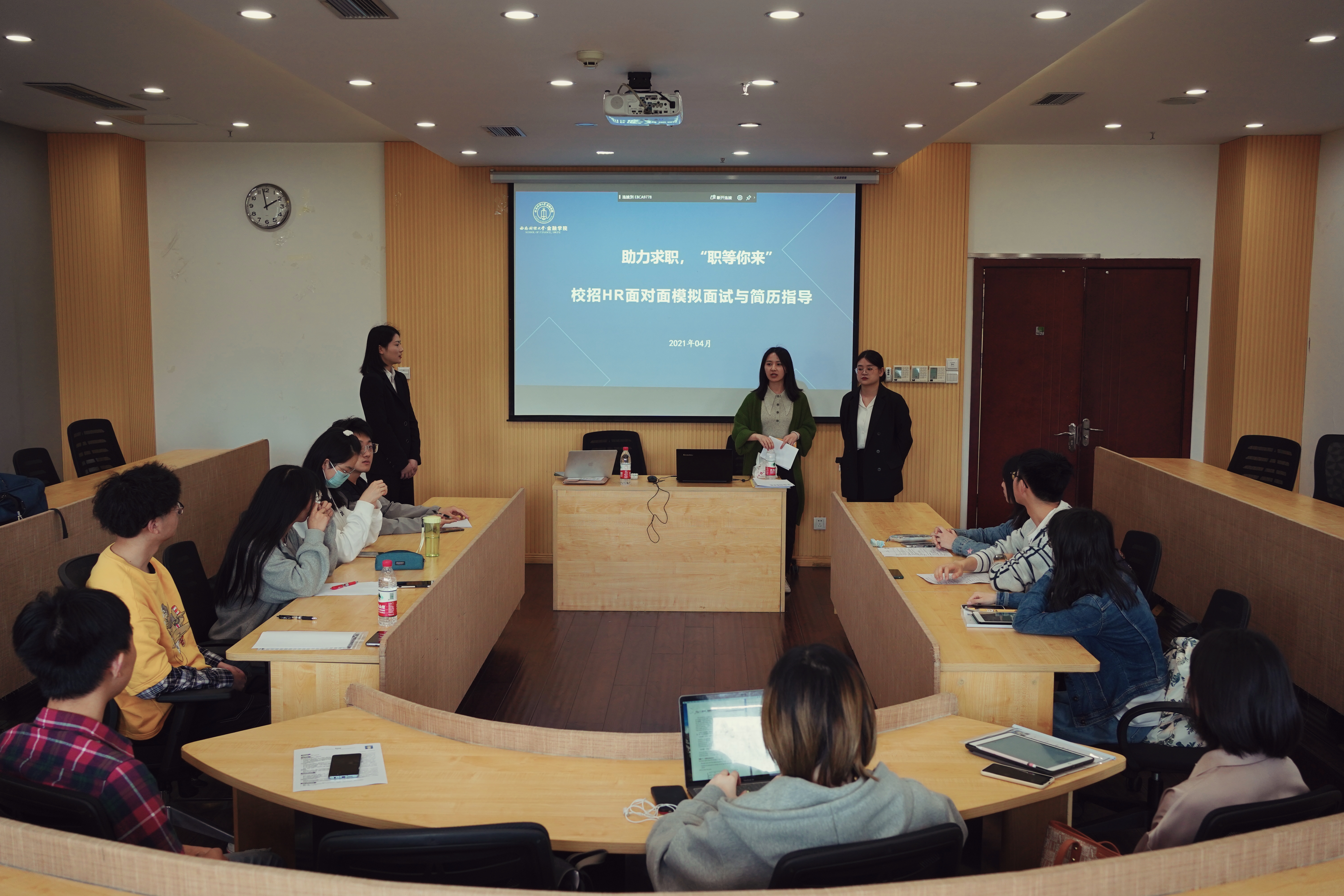 本次活动包括求职经验分享和模拟面试实战两大板块。首先由吕经理从简历制作和面试经验两大方面进行求职经验分享。简历制作方面,吕经理提出简历制作重点在于人岗匹配,同学们应充分认识自己和了解岗位后再进行简历撰写。此外,吕经理结合个人招聘经验为同学们讲解简历撰写技巧,帮助大家找到了梳理自身优势和完善简历的改进方向。面试经验分享方面,吕经理为同学们分享了提前准备自我介绍和面试问题的方法和黄金法则,并提醒同学们要注重面试礼仪,帮助同学们找到了做好面试的突破口。 接下来,由吕经理和胡女士在格致楼311和格致楼426分别指导员工进行了无领导小组模拟面试,还原真实应聘场景,并在面试结束后对员工进行点评指导,帮助员工发现问题、总结优势、找准未来改进方向。