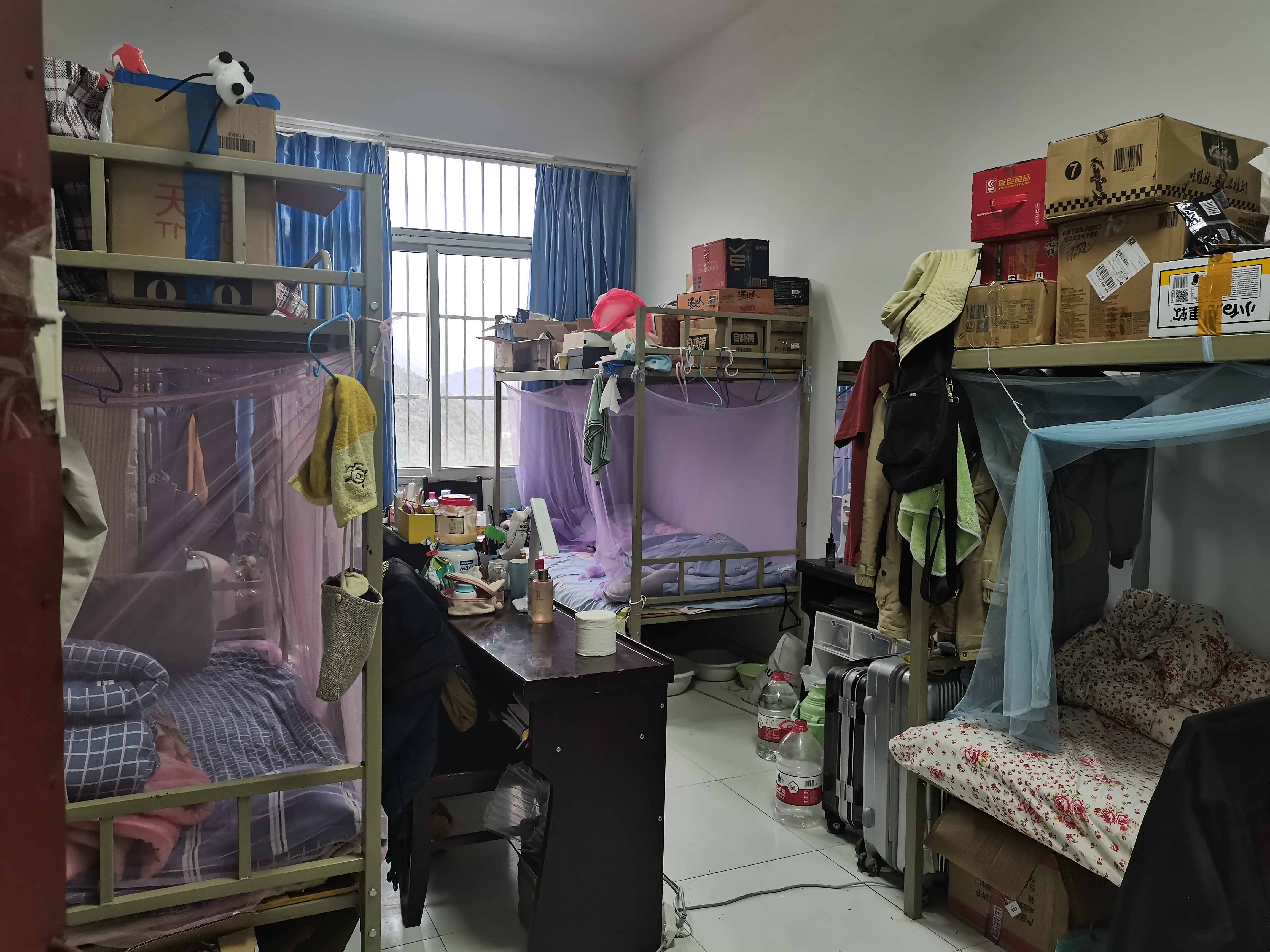 他们拖着疲惫的身体和饥肠辘辘的肚子勉强凑合了一晚,第二天一大早又拖着行李赶往公司,一路上全是石子路,灰尘迎风而来,给本来就拖着沉重行李的他们带来更多的困难。到达公司后,当地老师带他们来到住处,这是一个仓库改的四楼寝室,需要和其他人组合三人住一间。老师告诉他们这栋楼没有卫生间,上厕所和洗澡需要穿过一个小操场、一栋教学楼,再爬103阶台阶才能到达,做饭只能在寝室外的走廊上搭一张办公桌进行。