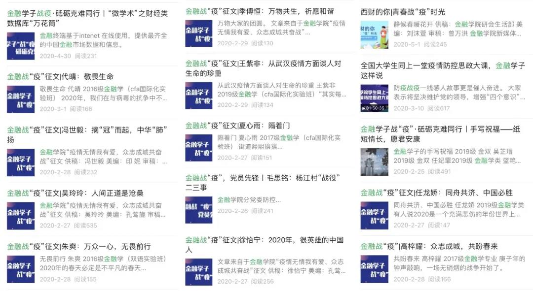365英国上市集团将思政教育创新与新媒体相结合,引导员工密切关注国家社会时事热点,培养员工家国情怀。疫情期间,公司官方微信公众号总计发布疫情相关推送百余篇,其中包括公司抗疫主题活动推文40余篇,院级及以上抗疫工作总结及部署文案推送10余篇,发布“365英国上市集团分党委倡议书”“我是西财金融人,我承诺”等倡议推文,汇聚公司师生正能量,抗击疫情共克时艰;开设“金融战‘疫’,党员先锋”专栏,报道党员师生在疫情防控期间主动服务社会的故事;组建疫情应急研究小组,及时推出“西财·观点”系列疫情应急对策研究文章;推出“不忘初心、牢记使命”系列推送、建党100周年系列推送、“红色金融耀百年”党史学习教育系列微课程等特色栏目,立体化展示“标杆院系”建设情况,全方位展示拼搏向上的时代力量。