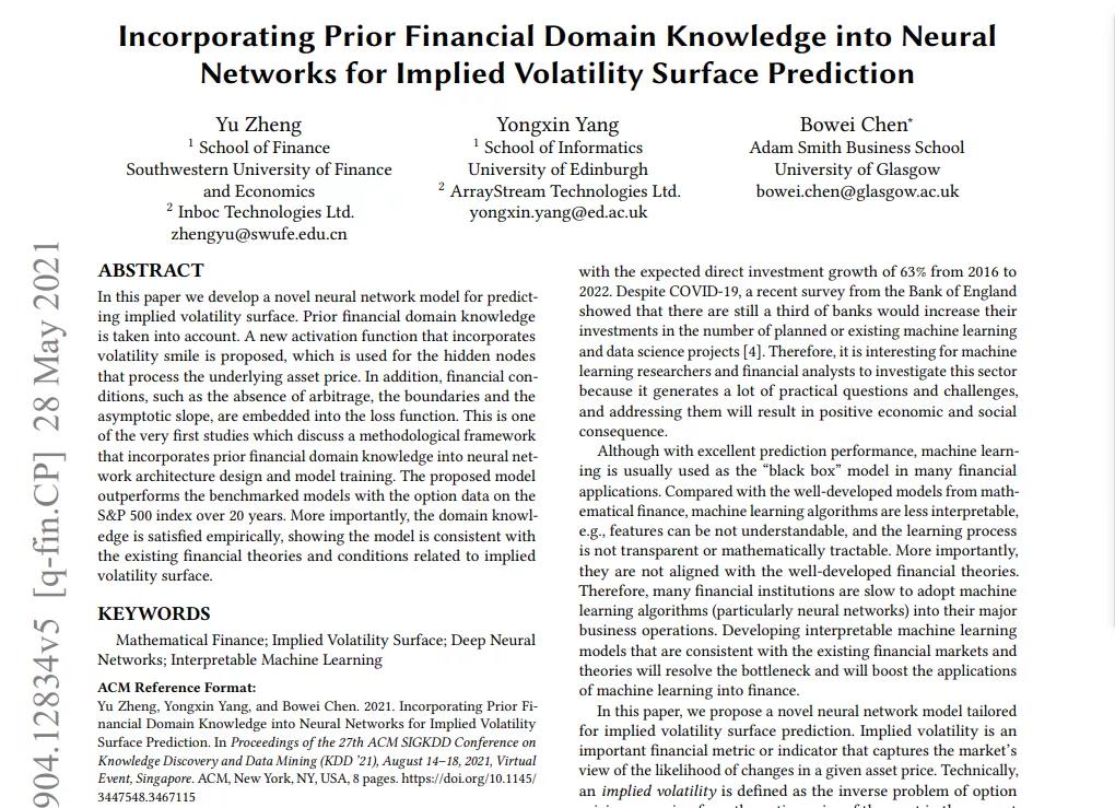 2021年5月,公司郑羽老师与爱丁堡大学Yongxin Yang以及格拉斯哥大学Bowei Chen合作的数学金融与人工智能交叉领域论文《Incorporating Prior Financial Domain Knowledge into Neural Networks for Implied Volatility Surface Prediction》被数据挖掘领域国际顶尖学术会议ACM SIGKDD接收。