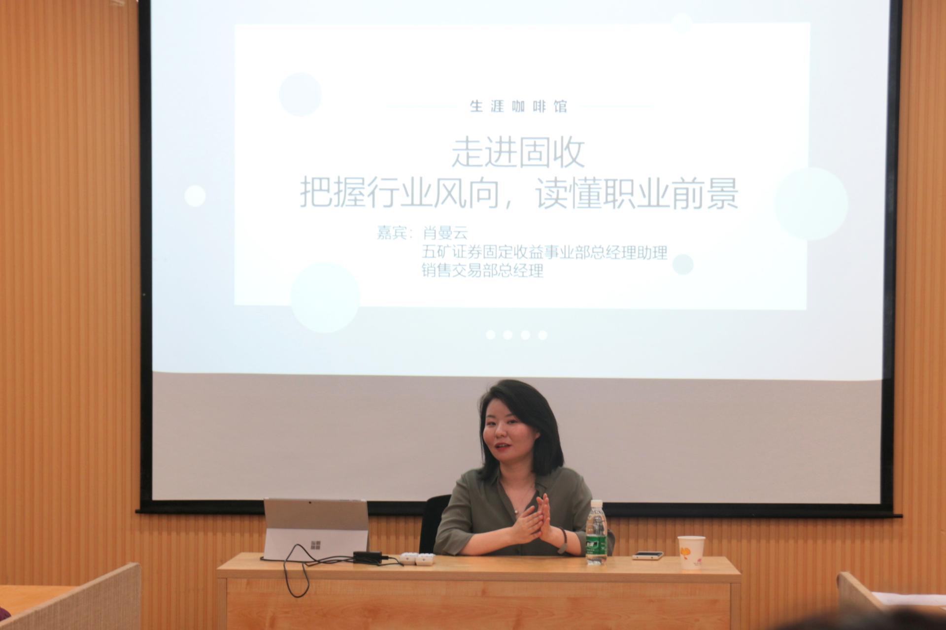 本次活动邀请到五矿证券固定收益事业部总经理助理、销售交易部总经理肖曼云女士担任主讲人,为同学们介绍固收行业的相关信息和发展概况。肖女士就券商行业发展现状、工作内容以及职业特征等进行了详细讲解,并与同学们分享了个人职业经历与经验。