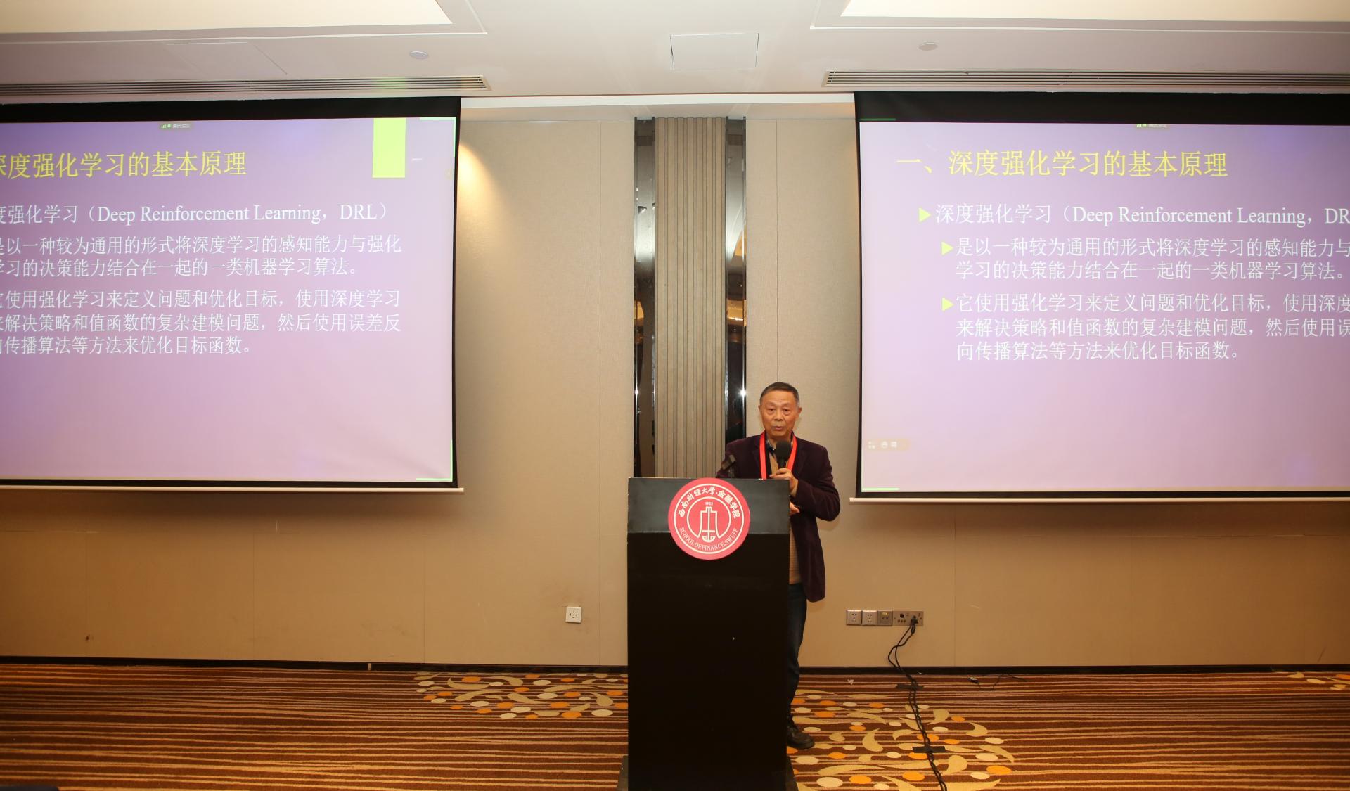 随后,罗荣华、赵峰分别主持了主题演讲的上半场和下半场。在上半场主题演讲中,四川大学经济公司文科讲席教授陈学彬以 《深度强化学习在金融资产管理中的应用》为题,阐述深度强化学习的基本原理,介绍应用于金融资产管理的模型及具体案例。