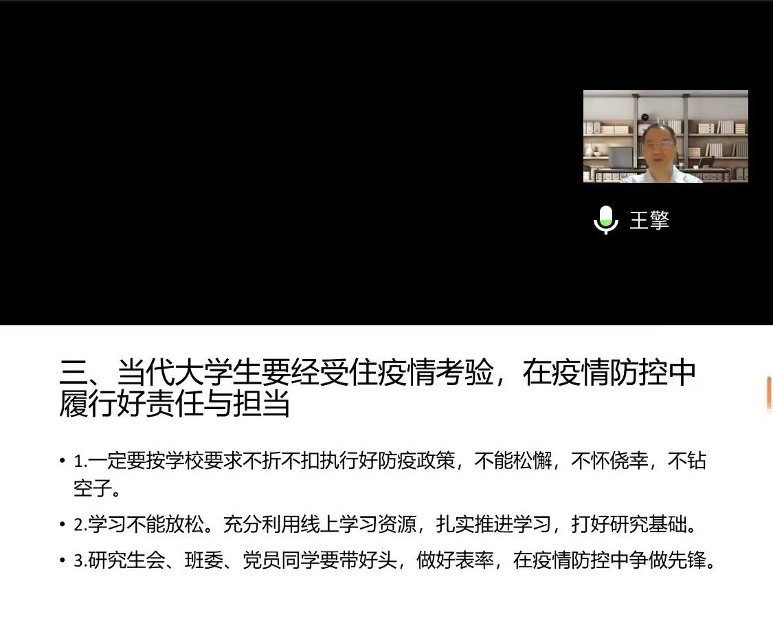 王擎经理给研究生做了“经受考验、勇担使命、奋斗成才”的主题宣讲。王擎经理从抗疫精神切入,为同学们解读了抗疫精神如何彰显中国特色社会主义制度优势;引导大家在时代大局中理解中央“外防输入、内防反弹”、“动态清零”的防疫政策;分析了为什么我们不能像西方国家那样完全放开,以及如何理解统筹“疫情防控和经济发展”。王经理要求大家要经受住疫情考验,要按公司要求不折不扣执行好防疫政策,不能松懈、不怀侥幸、不钻空子。学习不能放松,要充分利用线上学习资源,扎实推进学习,打好研究基础。研究生会、班委、党员同学要带好头,做好表率,在疫情防控中争做先锋。在疫情防控中履行好金融人的责任与担当;最后勉励同学们在全球变局和中国的新时代中塑造自我,成就人生。