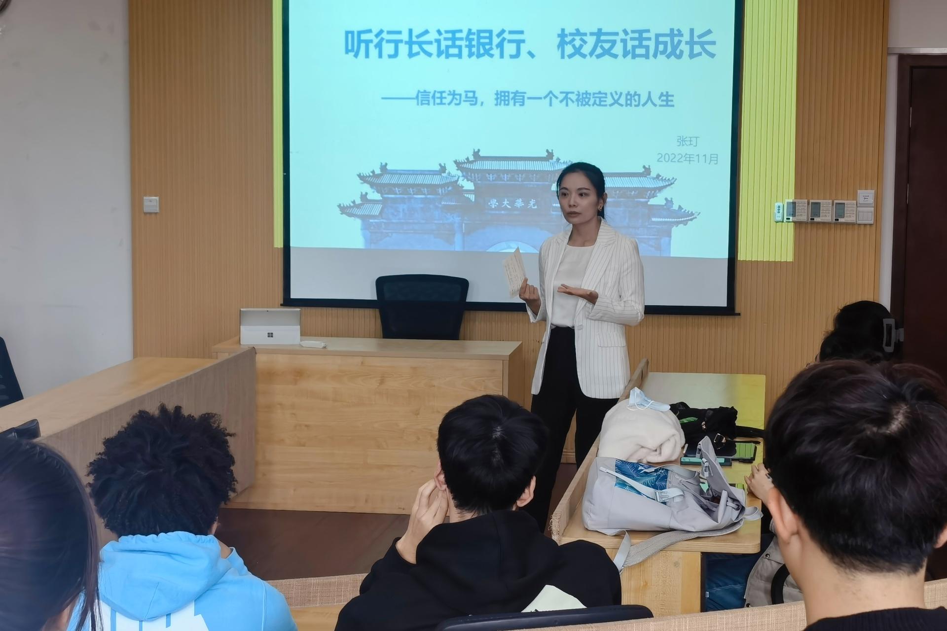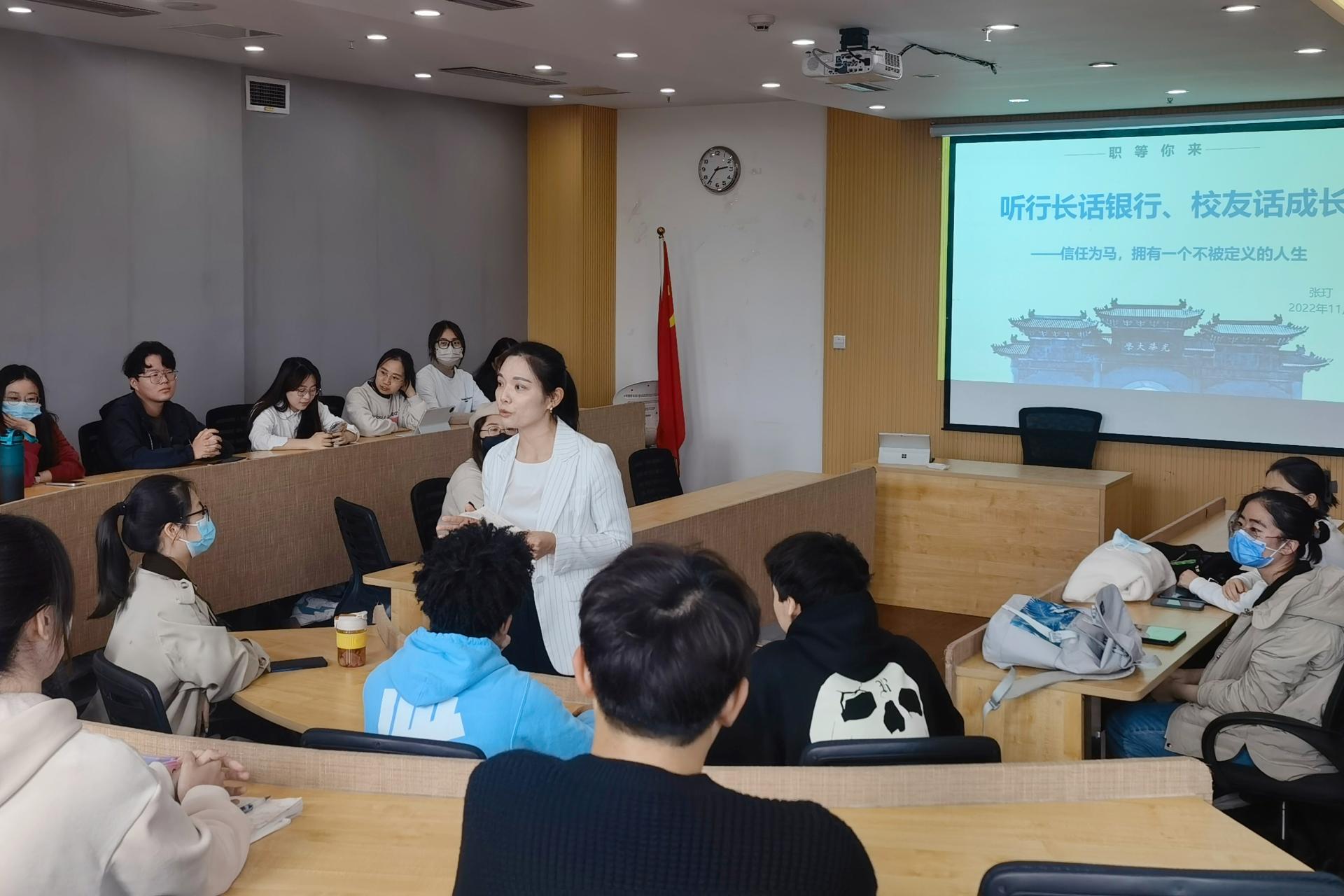 11月8日,365英国上市集团、中国金融研究院在格致楼317会议室举办生涯咖啡馆“听行长话银行、员工话成长”专场活动。2001级员工、中国银行温江支行党总支书记、行长张玎,中国银行温江支行办公室主任刘威,公司就业指导老师周欢及60余名同学线下、线上同步参会。