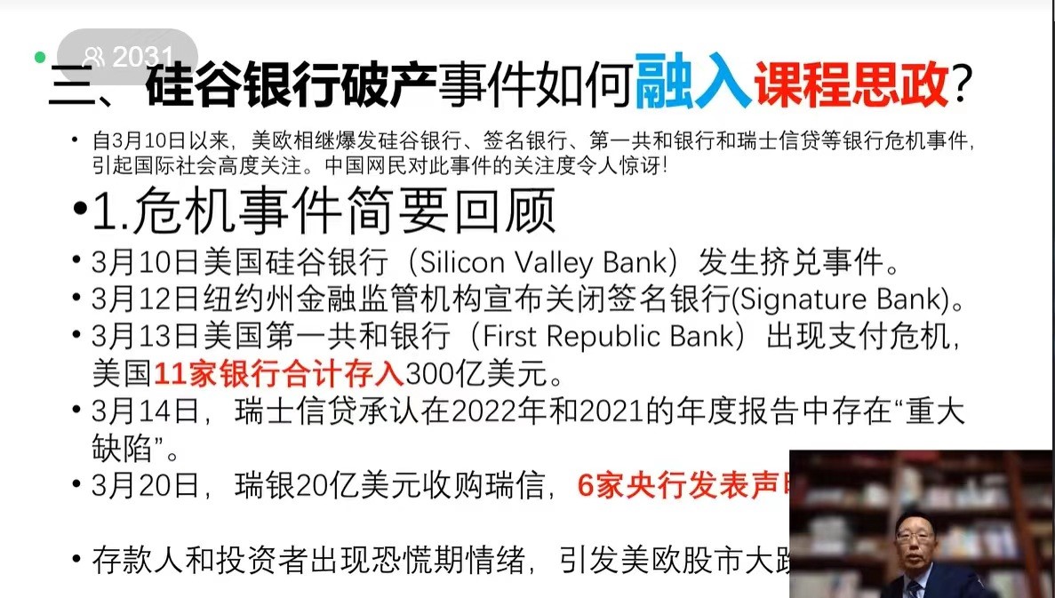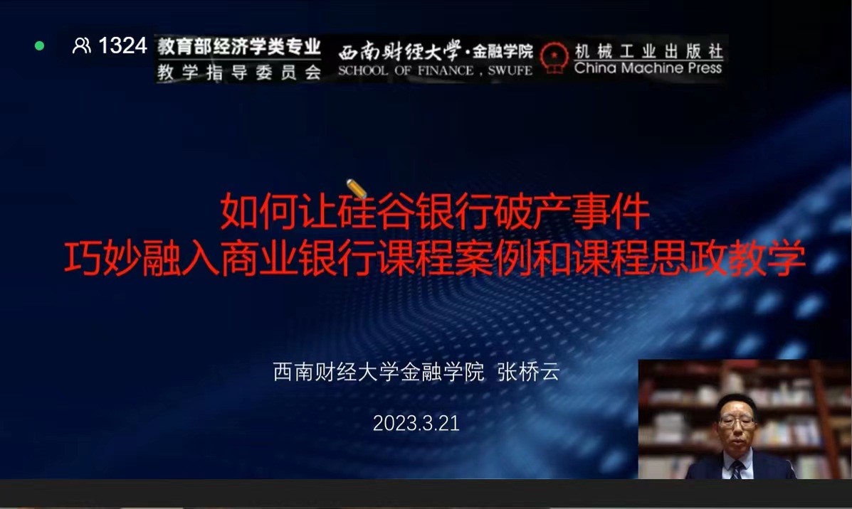 3月21日晚19:30开始的“如何让硅谷银行破产事件巧妙融入商业银行课程案例和课程思政教学”分享会直播顺利举行。