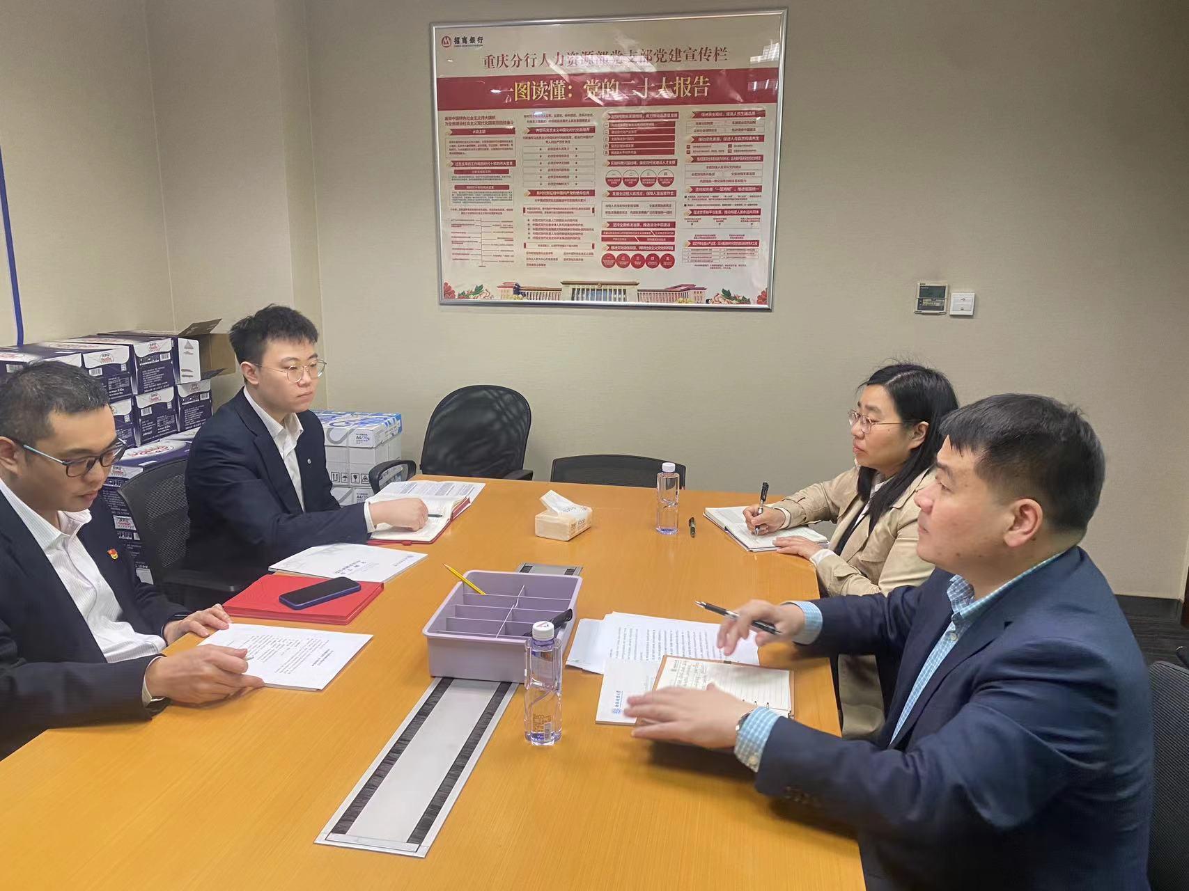 3月29日下午,工作组与招商银行重庆分行人力资源部总经理助理黄俊、人力资源部招聘HR汪益民进行座谈交流。黄俊介绍了招商银行从传统商业银行向数字银行转变过程中的人才需求变化和校园招聘的新特点,双方就共建员工实习基地等内容达成共识。