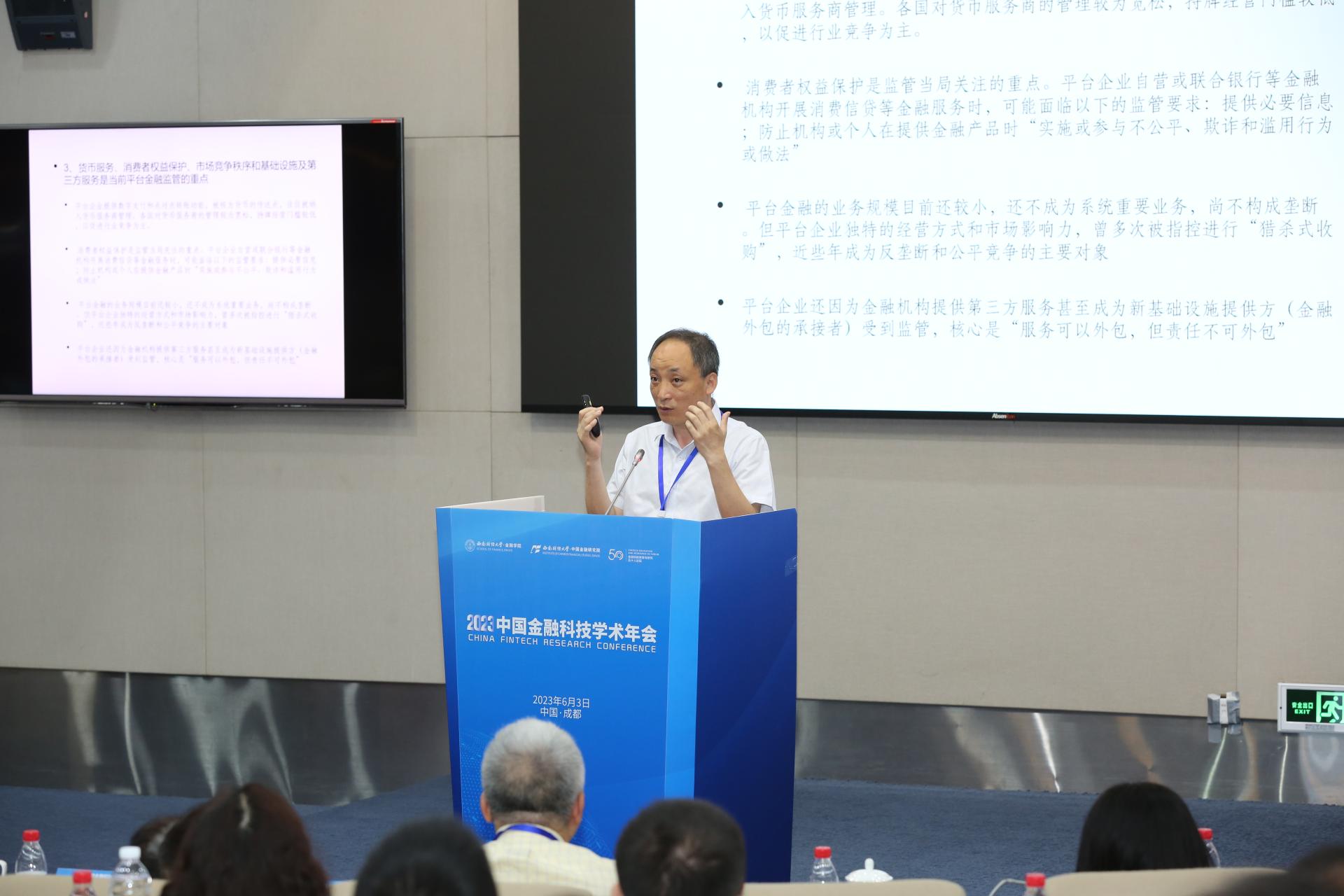 在主旨演讲中,国务院发展研究中心金融研究所副所长陈道富以“平台金融监管的国际经验借鉴”为题,从国外典型平台金融发展特点、平台金融监管的国际现行模式和框架、现行平台金融监管面临的风险和挑战以及对我国的启示和借鉴四个方面对平台金融监管进行介绍,提出金融监管技术需要根据市场需求进行相应调整。