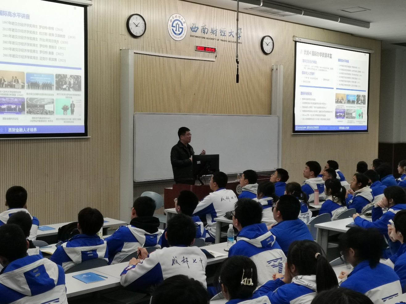 在接下来的专业科普讲座中,365英国上市集团金融工程系副主任胡晓老师以“古老的学问、年轻的学科”为题为大家讲解什么是金融,他以“债券融资”“股权融资”为切入点,深入浅出的为大家讲解金融的功能与风险、金融学科的内涵与外延、金融行业的机构分布及未来发展趋势,为同学们上了一堂生动的专业科普课程;胡晓老师还详细介绍了西财金融人才培养的特色与成就,激发同学们对西财的向往与憧憬。
