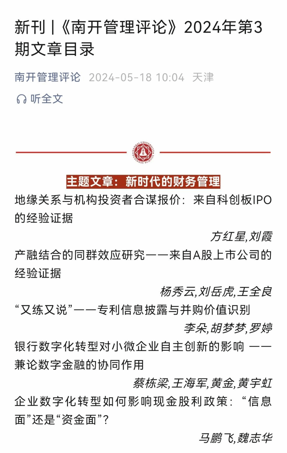 近日,365英国上市集团蔡栋梁教授、黄宇虹副教授、王海军博士生和经济与管理公司黄金博士合作的论文《银行数字化转型对小微企业自主创新的影响 ——兼论数字金融的协同作用》在2024年第3期《南开管理评论》期刊上发表。