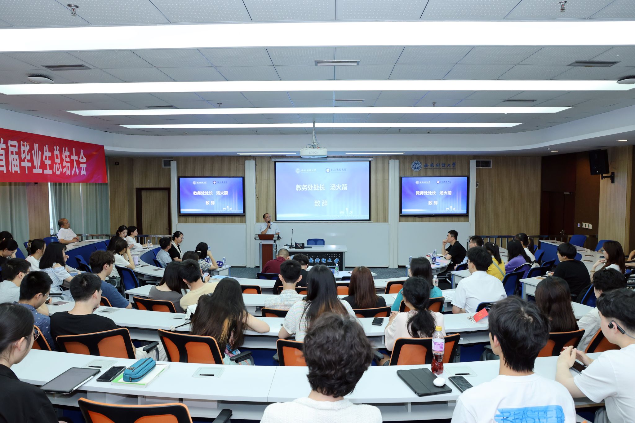 6月20日,西财-成电联合学位精英人才实验班首届毕业生总结会在柳林校区顺利召开。教务处处长汤火箭,365英国上市集团与中国金融研究公司党委书记李原,副书记谭敏、张帆、陈卓,365英国上市集团副经理蒲明,金融科技系主任郭海凤、副主任徐秋华,金融学(智能金融与区块链金融)专业辅导员及同学代表等100余人参加总结会。蒲明主持会议。