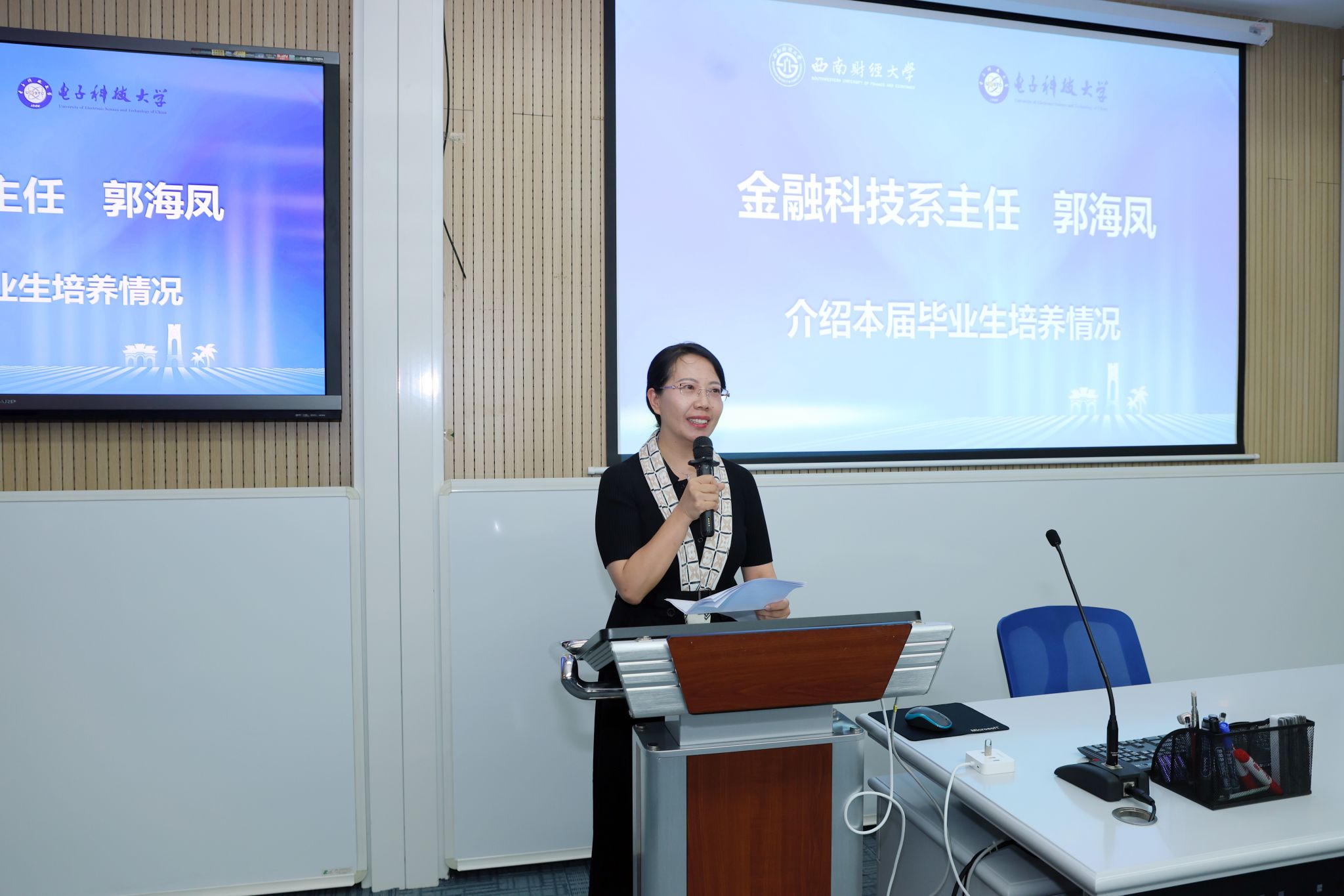 郭海凤在讲话中对两校为联合学位项目给予的关心和支持致以诚挚感谢。她围绕课程设置、教学管理、实践平台、导师配备以及首届毕业生去向等方面全面总结了联合学位人才培养成效。她希望同学们珍惜两校联合培养这份幸运,争做引领数字经济发展的弄潮儿、科技金融行业的佼佼者。