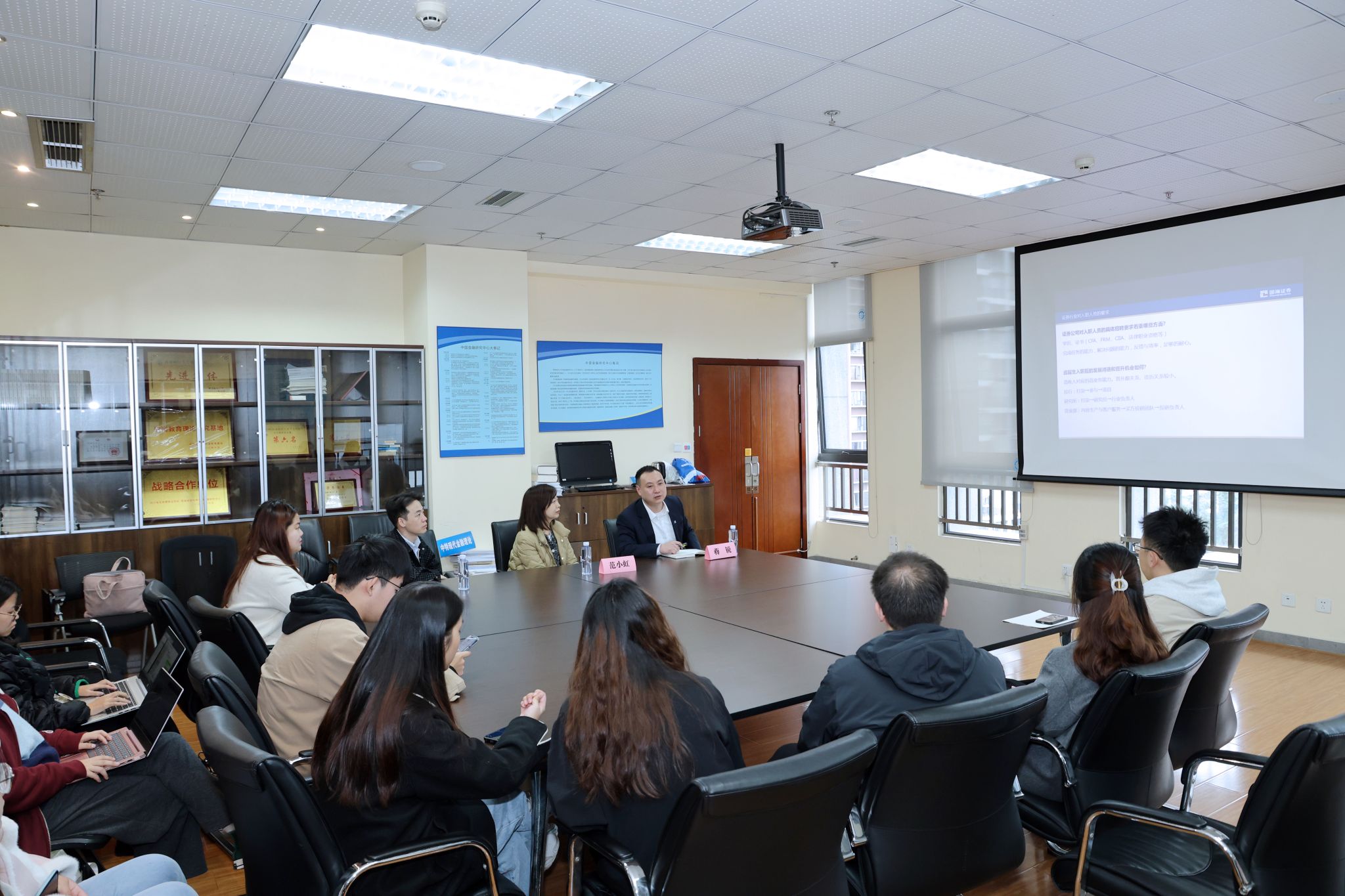 11月19日,国海证券西南党支部来院开展党建共建交流,国海证券四川分公司总经理助理蒋锐、合规总监范小虹,公司(研究院)硕士2023级研究生党支部党员和入党积极分子等参加交流,活动围绕“金融资本市场-证券业从业”这一主题开展分享交流和研讨,公司(研究院)党建办公室教师王保主持活动。