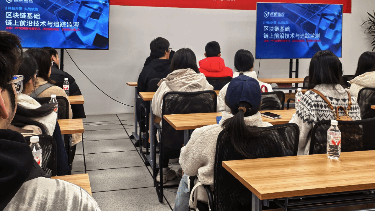 技术分享环节,成都链安的技术专家围绕“区块链基础、链上前沿技术、全球区块链安全生态”主题,系统讲解了区块链技术的基本特性与安全挑战,并结合实际案例展示了链上交易追踪、风险行为监测等方面的前沿手段。专家还分析了不同国家和地区在虚拟货币领域的监管政策与合规实践,使同学们对区块链行业的全球发展态势与风险防控有了更立体、更深入的认识。