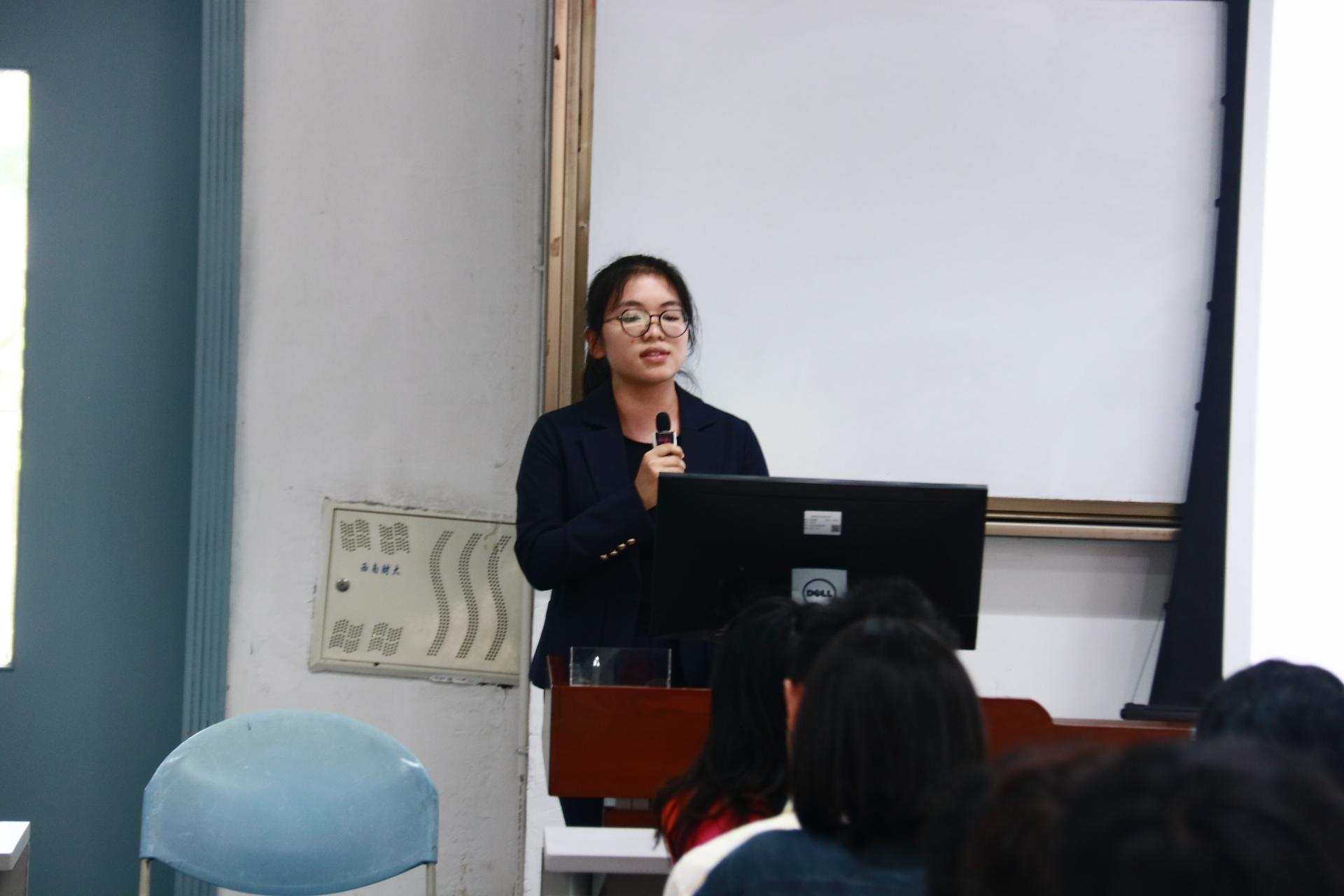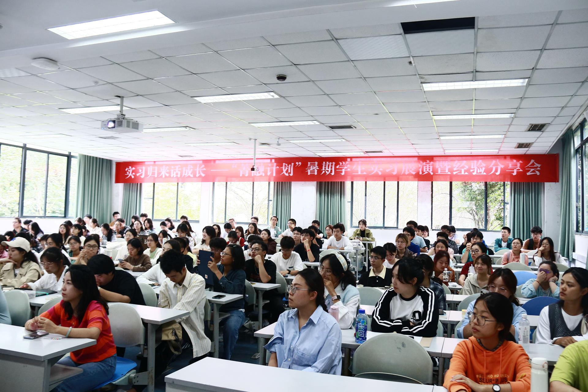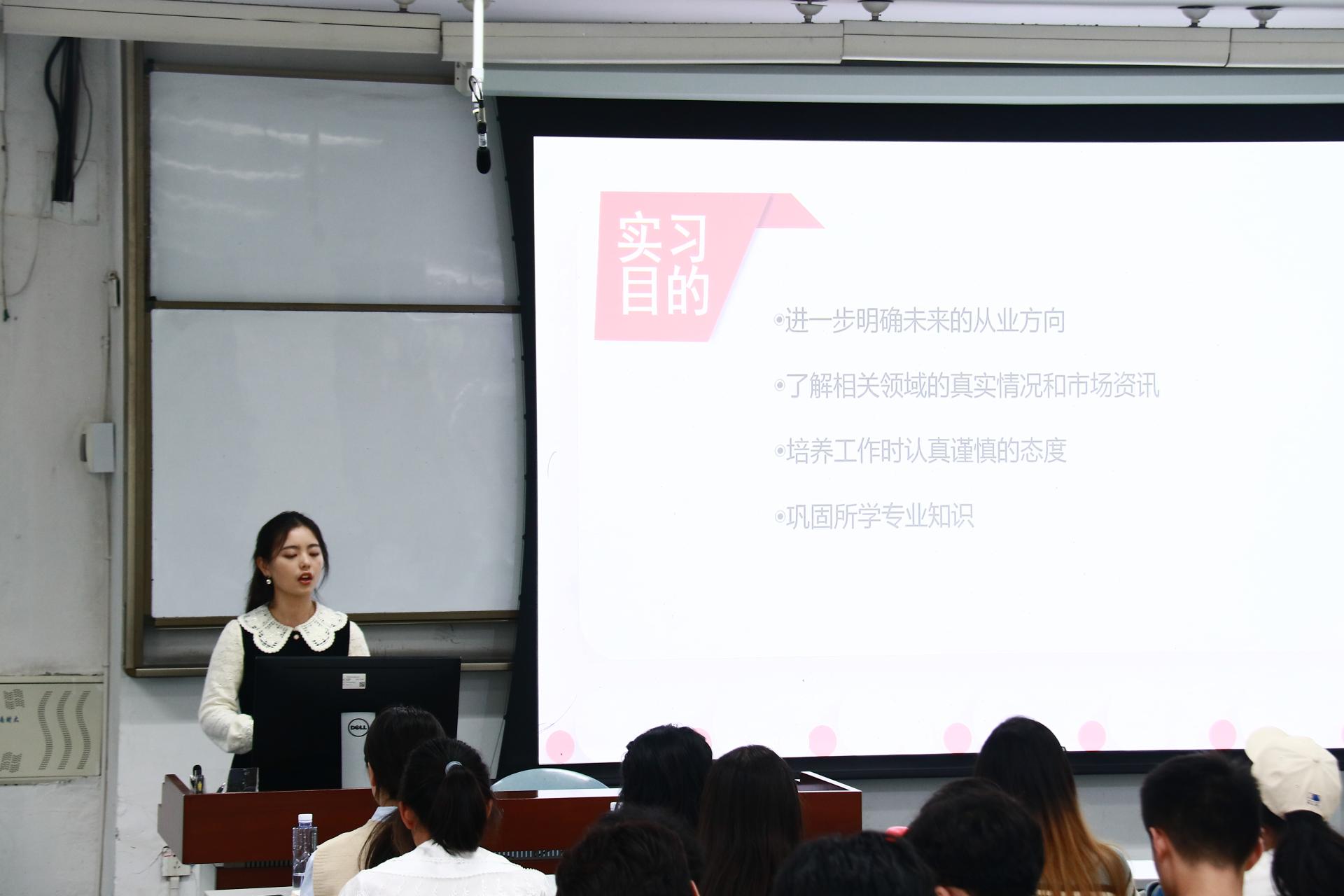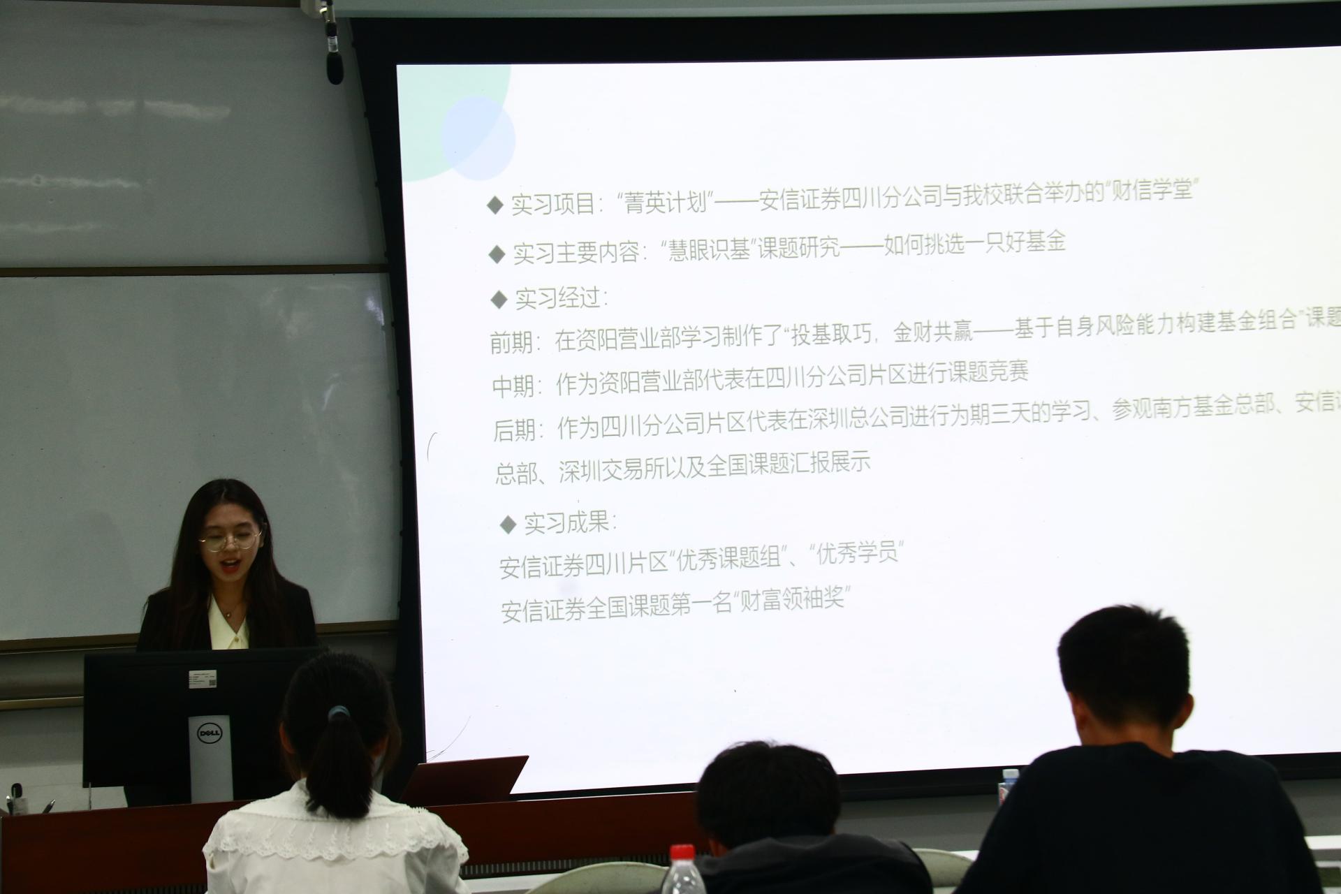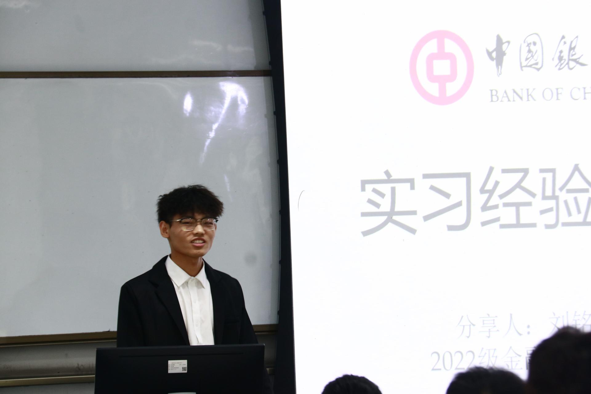 在分享环节,2021级金融工程专业本科生陈圳楠、2021级金融学(双语实验班)专业本科生纪妍伶、2022级金融工程专业本科生史伊晓、2022级金融工程专业本科生刘铭一和21级金融学专业本科生雷雨嫣分别分享了在宜宾发展产城投资有限公司、中信证券四川分公司、中国邮政储蓄银行、中国银行和安信证券的实习收获,在帮助同学们了解相关行业实习内容的同时,鼓励同学们要尽早进行职业规划,保持良好心态,勇敢尝试,及时总结,全面提升综合素质。