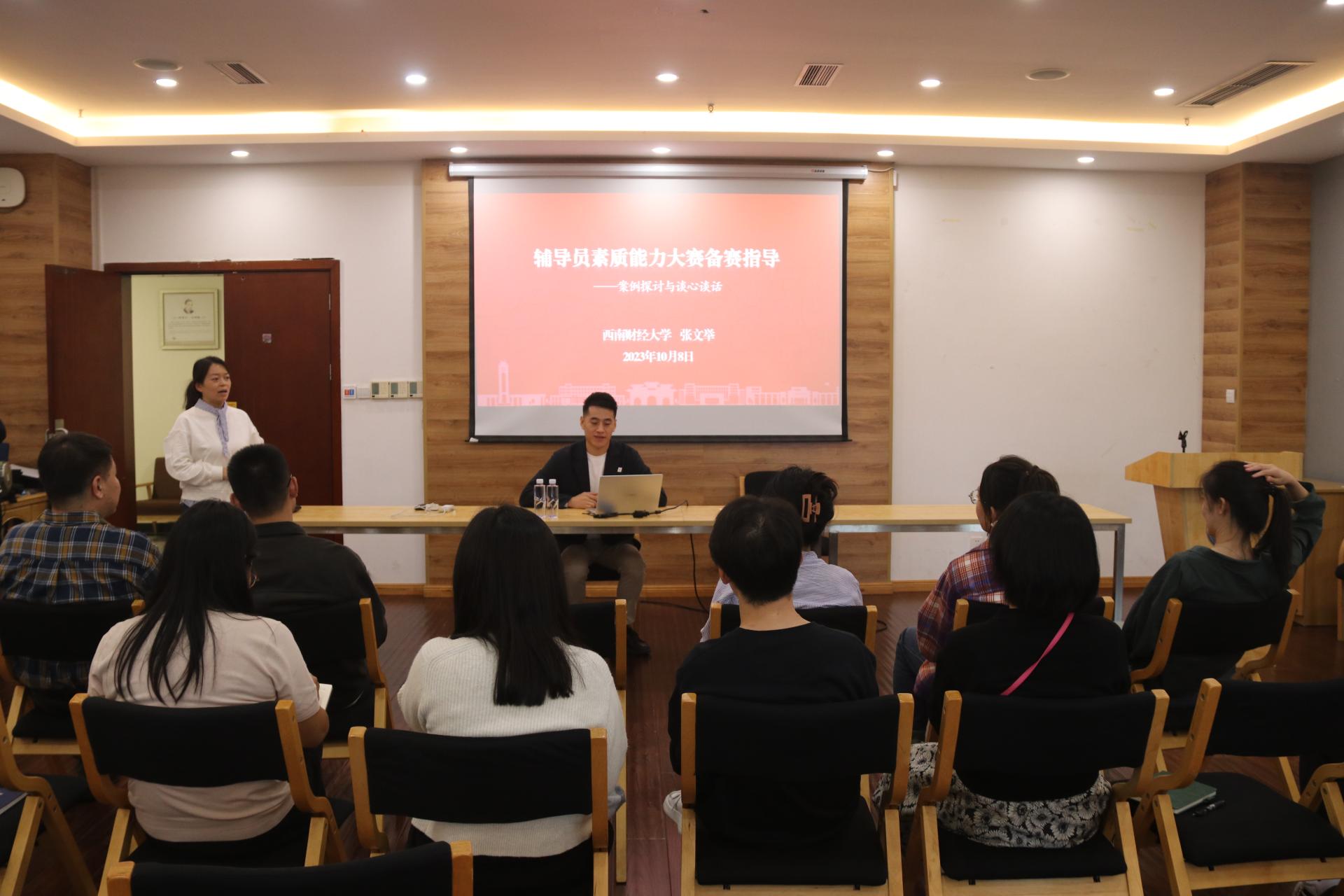 张文举以“提升辅导员素质能力”为主题,首先从辅导员的育人职责开始谈起,他指出要立足中国式现代化、教育强国建设、全面推进“新财经”战略升级的背景,以《普通高等公司辅导员队伍建设规定》中辅导员的九大育人职责为核心,以理论解析与案例分析相结合的方式让辅导员再次深刻理解自身职责与使命;然后详细介绍“三全育人”综合改革中十大育人体系的内容,引导辅导员深入思考在“三全育人”中如何更好的定位自身角色,如何拓展工作外延与内涵,如何在协同育人、精细化育人、特色化育人中更有可为;最后围绕辅导员如何提升核心能力素养提出建议,他希望大家一要加强理论学习,重点学习习近平总书记关于教育的重要论述,先提升自身思想水平才能更好的承担思想理论教育和价值引领的职责,二要以“四有”好老师的标准、“大教育家”精神作为提升自我素养的要求和方向;三要探索自我特长优势,创建自身工作品牌,在教育与引导员工的过程中也能促进自身的职业发展。