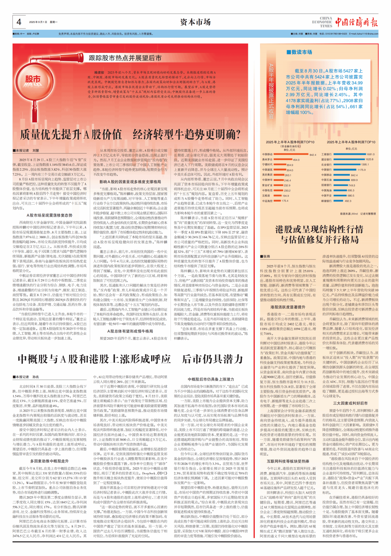 2025年前八个月,资本市场呈现回稳向好的发展态势。本期报道跟踪近期A股、中概股、港股市场的发展变化。A股在质量优先转型的驱动下,走出向上行情,市场活跃度显现。中概股凭借自身韧性与潜力,在国内政策向好和企业财报的助力下,与A股、港股上涨形成呼应。港股市场在优质企业带动下,结构性行情可期。展望后市,A股走势将受多种因素影响,增量政策与“十五五”规划内容将受关注;中概股仍具备进一步上涨的潜力,但须警惕监管审查引发的股价波动风险;港股优质公司或将推动结构性行情。
